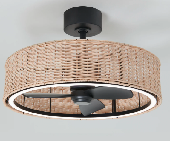 Wicker-style ceiling fan glowing warmly in the living room, buy now for $209.99.